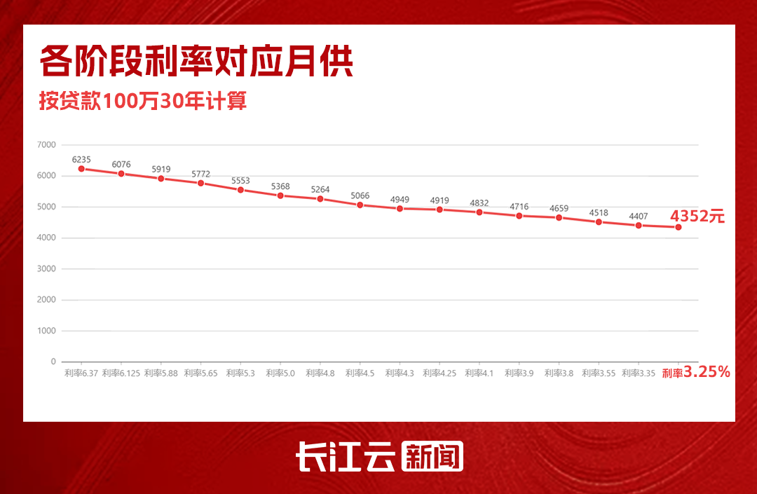 利率低了,月供会降多少?长江云新闻记者给大家算了一笔账:在去年5月,商贷利率还维持在首套3.9%,二套4.9%。如果贷款100万元,30年还款期,首套房每月要还4716元,二套房每月要还5307元。而现在,同样的贷款金额和年限,首套房每月月供为4352元,减少了364元;二套为4407元,减少了900元。