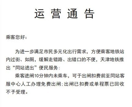 今年来,上海地铁、天津地铁、南昌地铁先后宣布:乘客10分钟内“同站进出”免费服务。