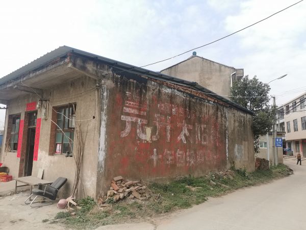 在阮家塘上湾2号附近,一栋老房子的侧墙上有一幅喷绘广告,红色和白色油漆已经变色脱落,内容模糊。