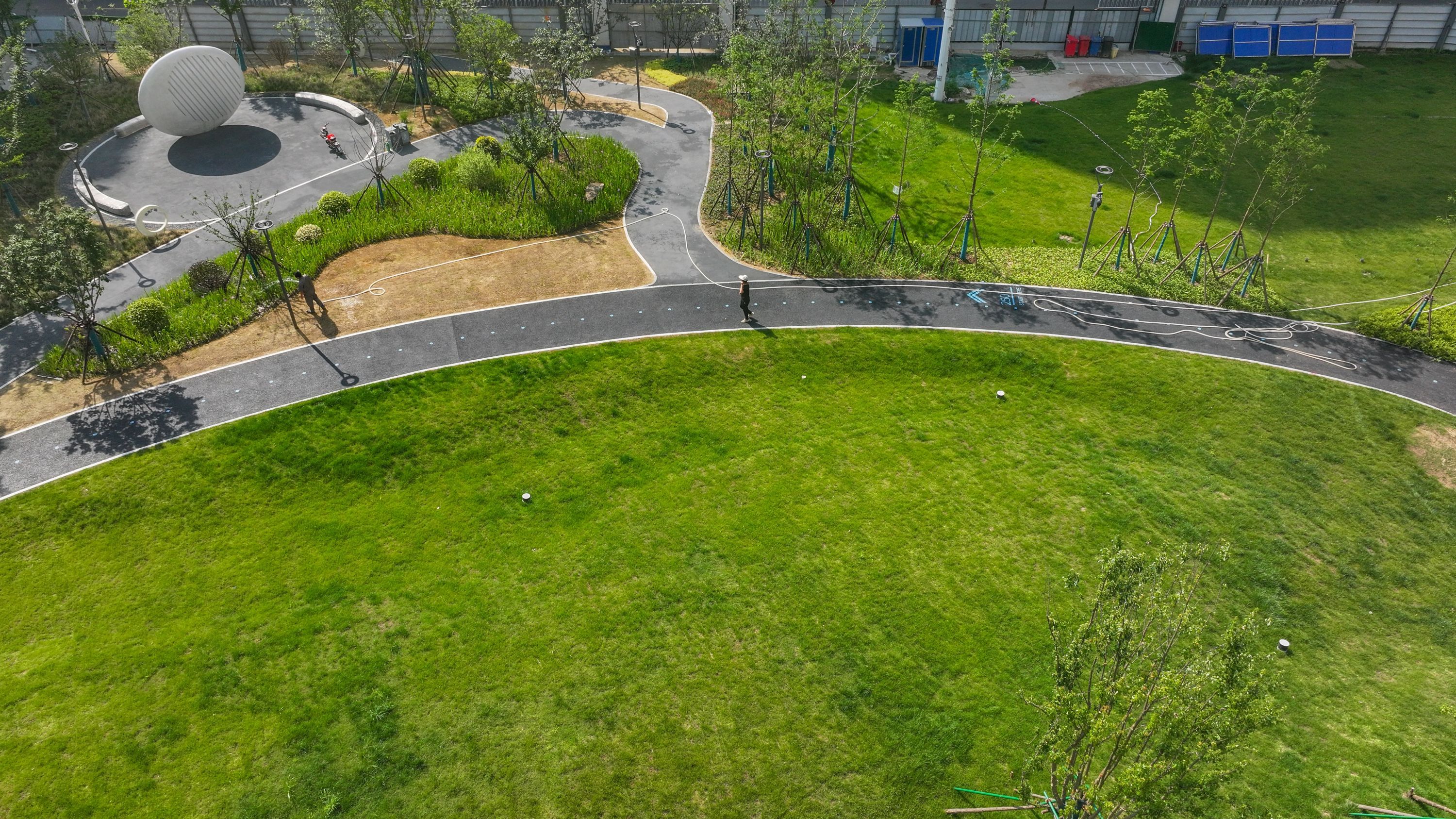 公园修建了370米环形跑道,还修建了光影陪跑墙。市民跑步时,影像会投射到屏幕,如同有另一个“我”在陪跑。还建有一座篮球场,一座儿童游乐园。