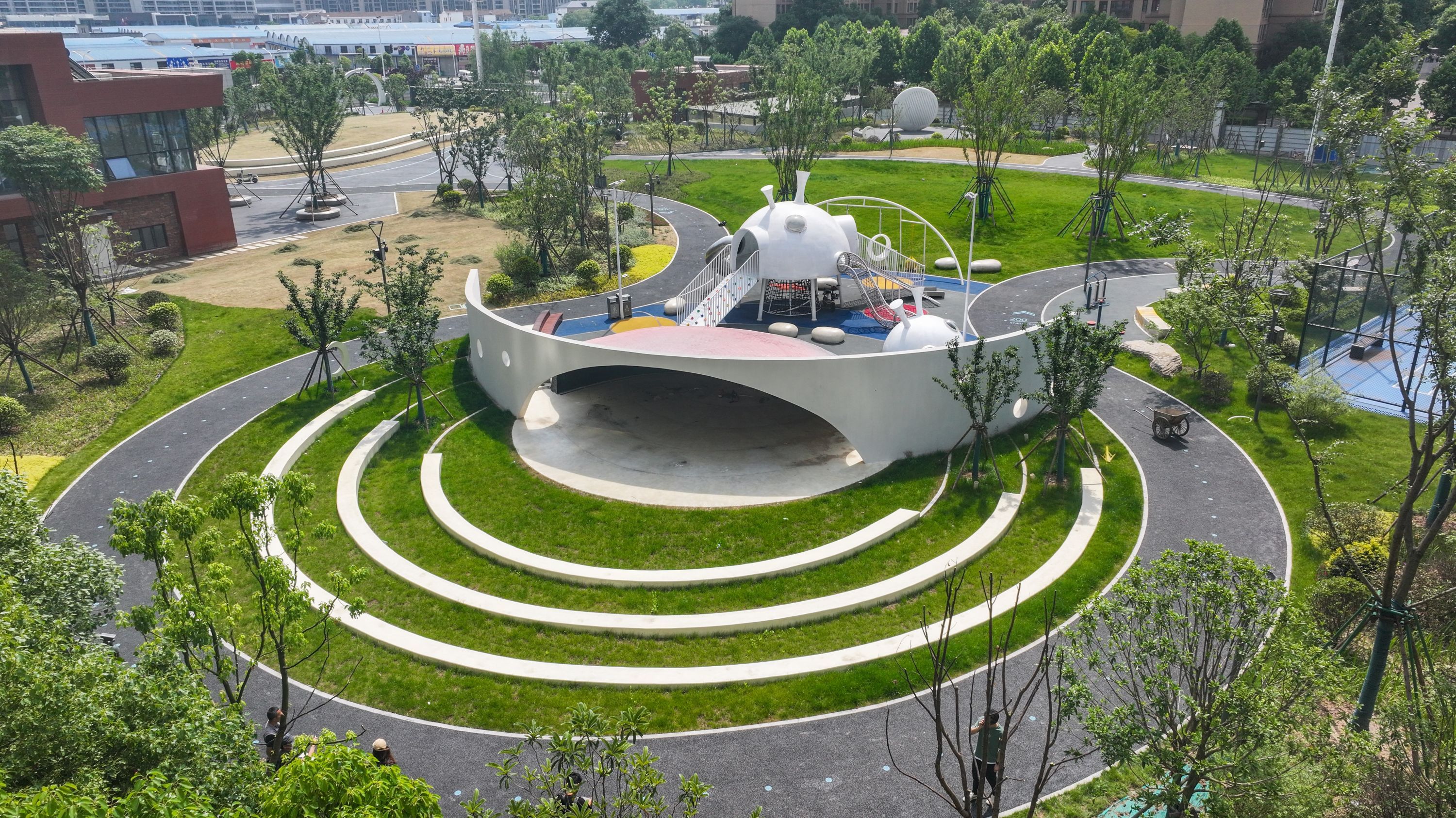 公园建在一座小山上,树木青翠,绿草如茵,鲜花盛开。市民或在环山步道漫步,或在山顶凉亭拉琴,或在儿童游乐区遛娃。
