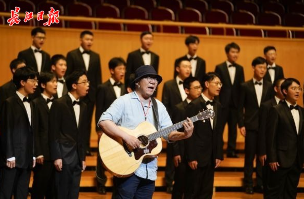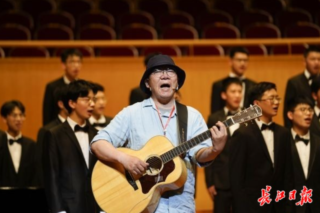 武汉民谣音乐人冯翔抱着吉他走上舞台,与合唱团一起唱起了那首耳熟能详的《汉阳门花园》。他是武汉一中1981届校友,现场,他回忆起武汉一中的时光,笑着讲述当年在走廊打篮球被老师批评的往事,感叹一中对他人生有着深深影响。“到现在我写歌词时,经常会感觉耳边出现当年语文老师的声音,仿佛他在叮嘱我这样写不好、这样写不错。”冯翔也把一中写进了歌里。“屋里住在王家巷,在一中上的中学……”他独自弹唱一曲《六渡桥》,用武汉方言腔调唱出一代人的回忆。