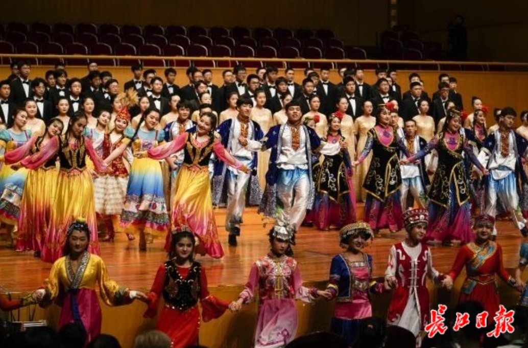 伴随着热力十足的新疆舞蹈,武汉一中阳光男声合唱团团员们从观众席中边唱边走上舞台。欢快动感的《青春舞曲》、与说唱“混搭”的《三字经》、优美动听的《想你的365天》……音乐会上,武汉一中阳光男声合唱团的表演赢来阵阵掌声。