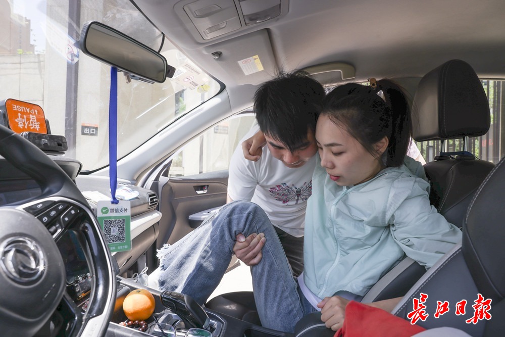 的士司机余波按提示,小心地抱起王娟,放到副驾驶位上,并帮她固定好双腿,系好安全带。 记者胡冬冬 摄