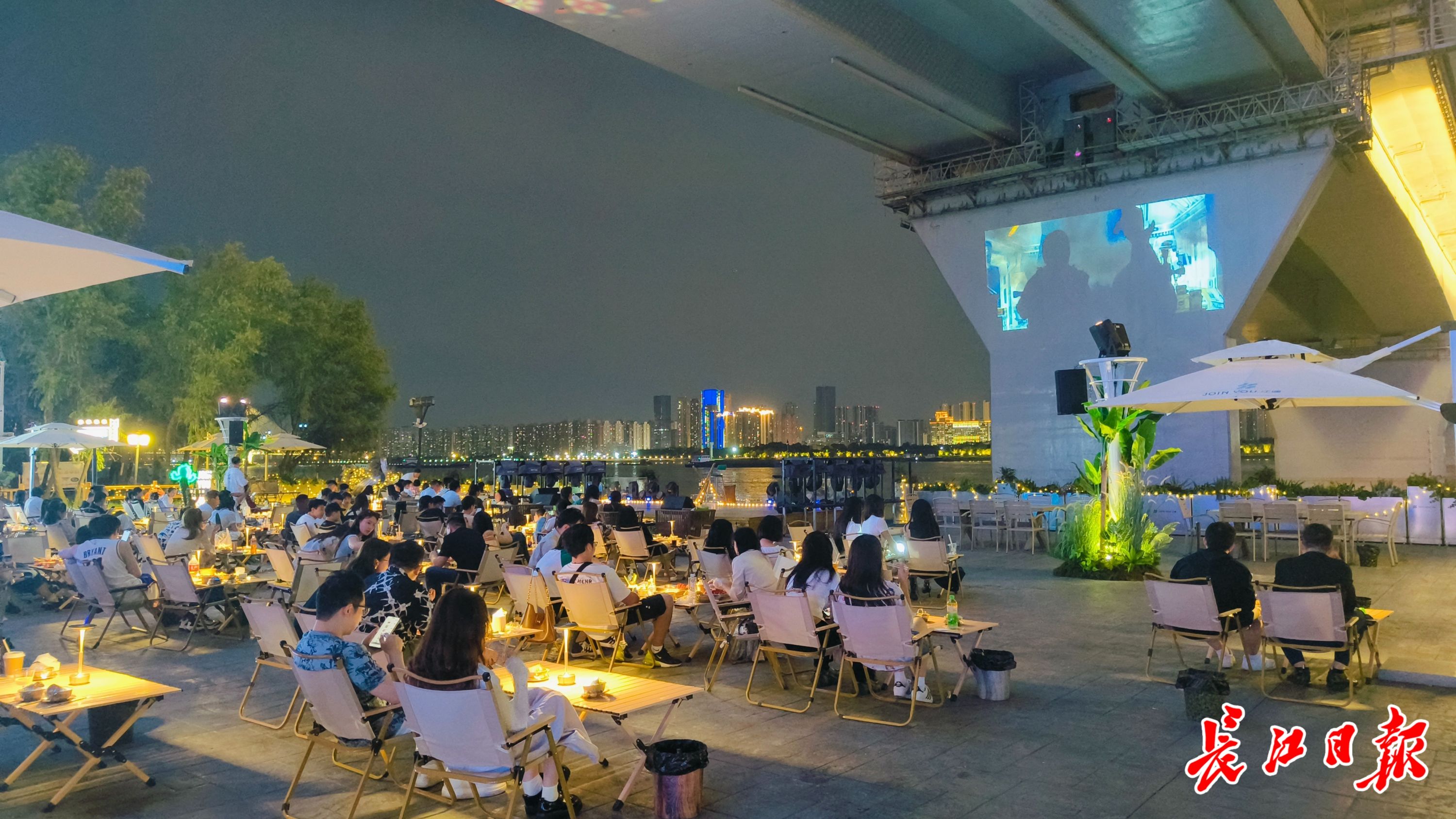 长江日报记者注意到,进入营地不收门票,场地内设有免费观影区和营业区。现场观影氛围感十足,芭蕉树、仙人掌、露营桌、沙滩椅,还有餐吧、露台等。当灯光打到桥底,还会呈现出星空、樱花、水波纹等图案,星空顶情景再现。当天晚上下起小雨,也不是周末,80张露营桌仍旧座无虚席,几乎全是年轻人结伴而来,有情侣相约,也有三五成群的朋友聚会。有人聚精会神地看着电影,有人拿着手机自拍美景,有人小声聊天,还有人喝着咖啡、啤酒,吃着小龙虾、烤肉等。当电影播放完毕,乐队歌手驻唱演出,又是另一番浪漫情景。游客在网络上最为关心的问题——有没有蚊子叮咬?记者穿着裙子在营地呆了一个多小时,并未感觉到有蚊虫叮咬。