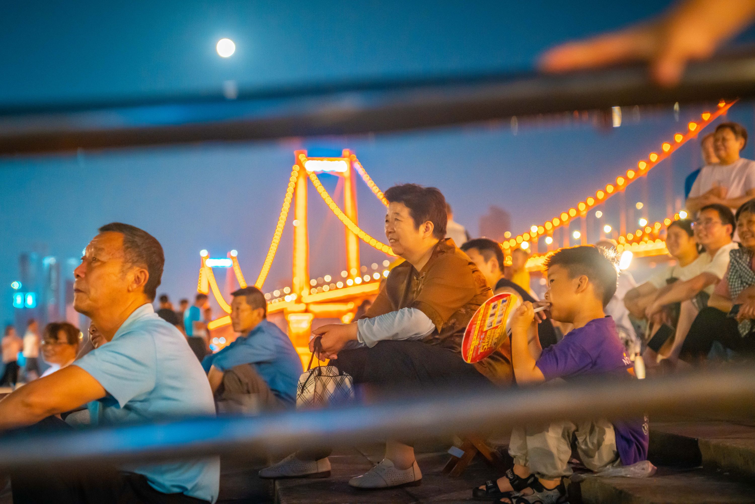 汉口江滩边,长江二桥桥墩变身电影幕布,引来众多观众。记者黄丽娟 摄