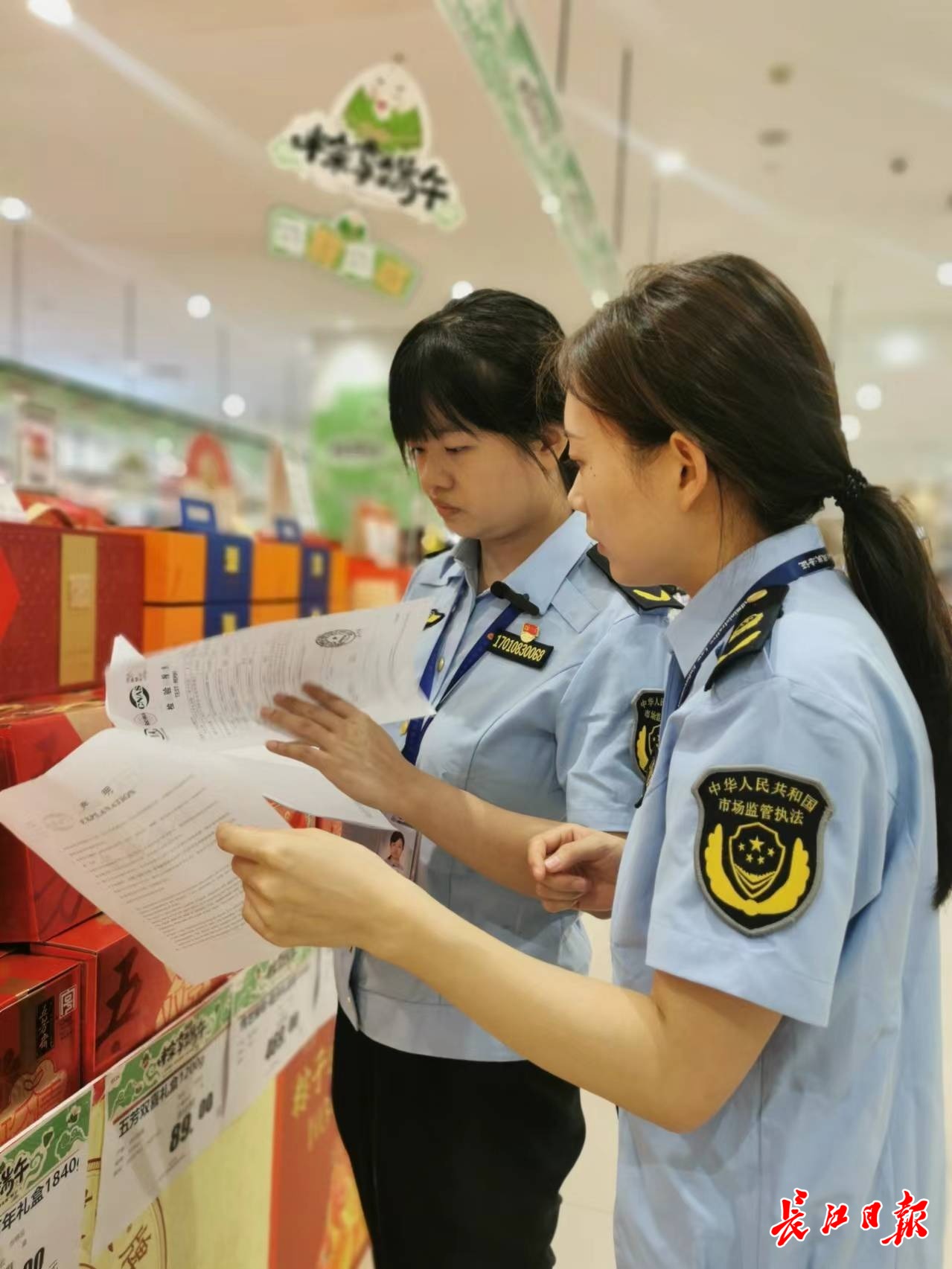 东西湖区市场监管人员查看超市证照是否齐全,公示是否规范,监管人员还仔细查看了食品从业人员的健康证,发现健康证都在有效期内。随后,监管人员又查看了节令食品的价格标签,标签显示明码标价,与商品一一对应。在对进销货凭证、检测报告的检查中,超市经营人员拿出了有效凭证及报告。