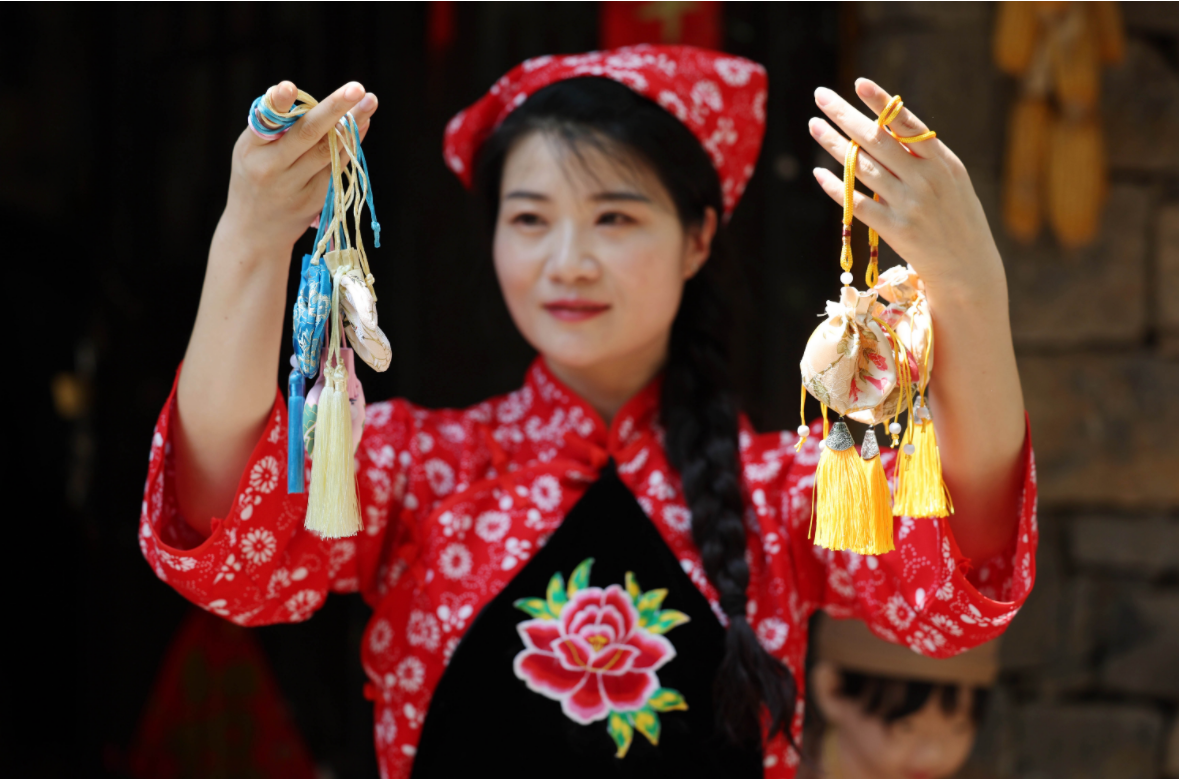 手工艺人展示制作好的香囊。 新华社发