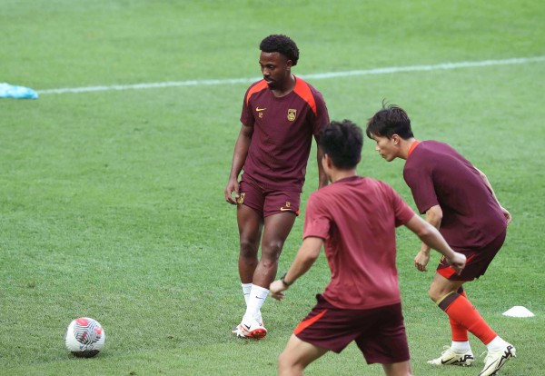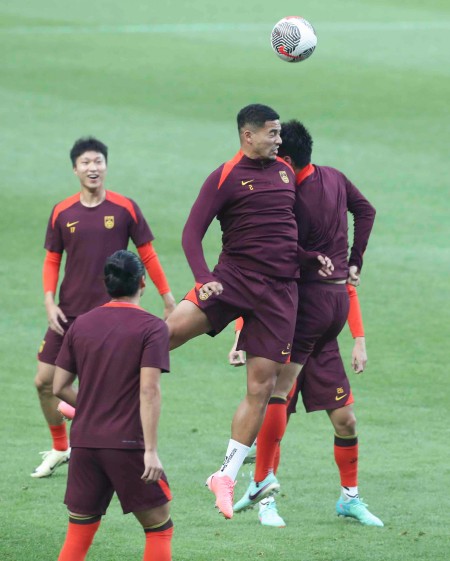 6月10日,中国队球员费南多(左)在训练中。 新华社发