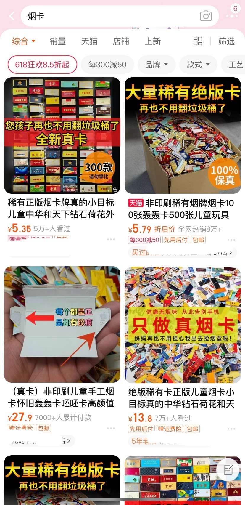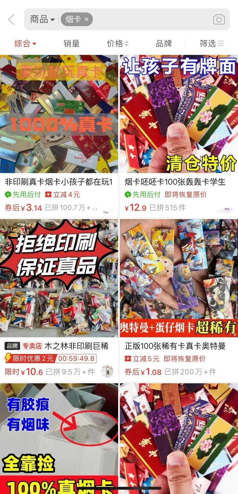 在淘宝页面,记者搜索关键词“烟卡”立刻出现相关商品,不少商家打出“您孩子再也不用翻垃圾桶了”“大量稀有绝版卡”“只做真烟卡个个有胶痕”等广告标语。一家名为“天天特卖工厂店”的店铺显示该店“烟卡”销售量已超8万,仅商品评价数量就已超3000条。记者看到,有评论这样写道:“孩子玩烟卡总比玩手机好。”在拼多多搜索“烟卡”,同样出现大量商品,记者看到不少店铺右下角显示“已拼100万件”等字样。