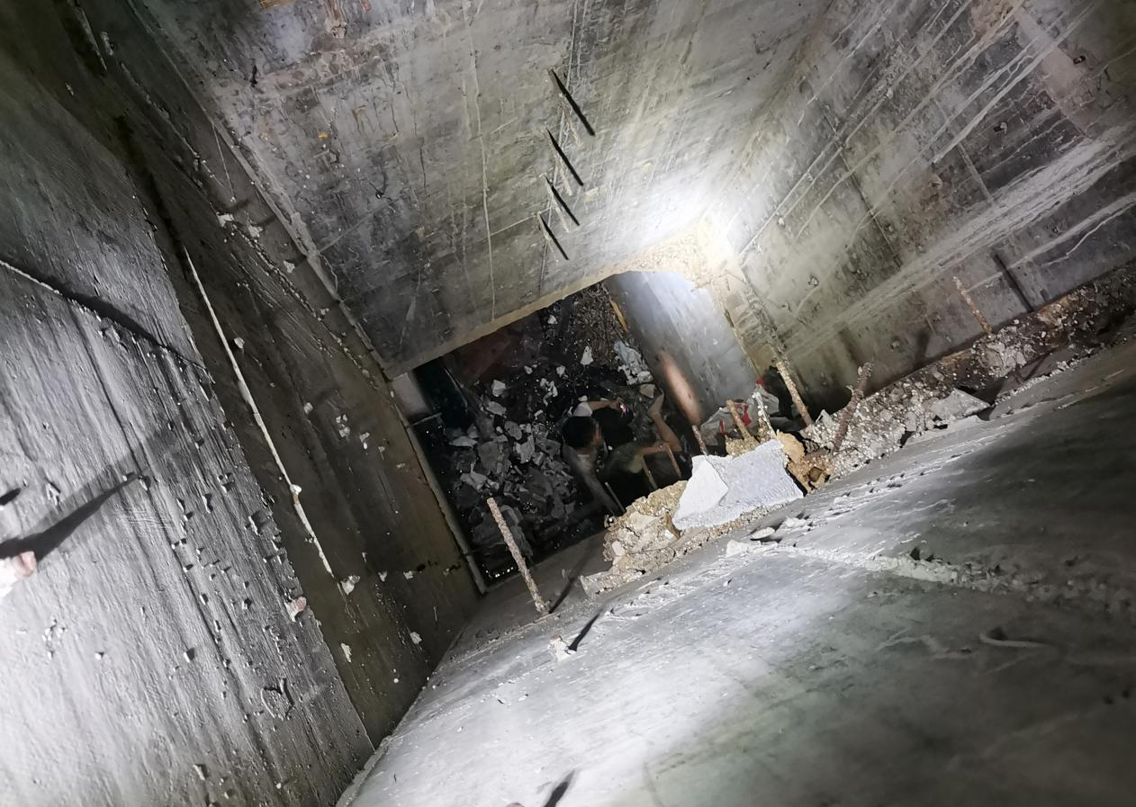 了解现场情况后,消防员迅速制定了救援方案。一组消防员进入地下停车场,寻找可直接到达井底的通道;另一组消防员则穿戴好安全防护装备、架设好救援专用三脚架后,在井口处待命,准备采用担架将两人从井底吊升出来。从地下停车场停车位通往通风井的通道结构复杂,消防员在停车场工作人员带领下,根据2人坠落的方位,在破拆开一处安全门后,顺利抵达两人被困位置,宽慰2人不要慌张。