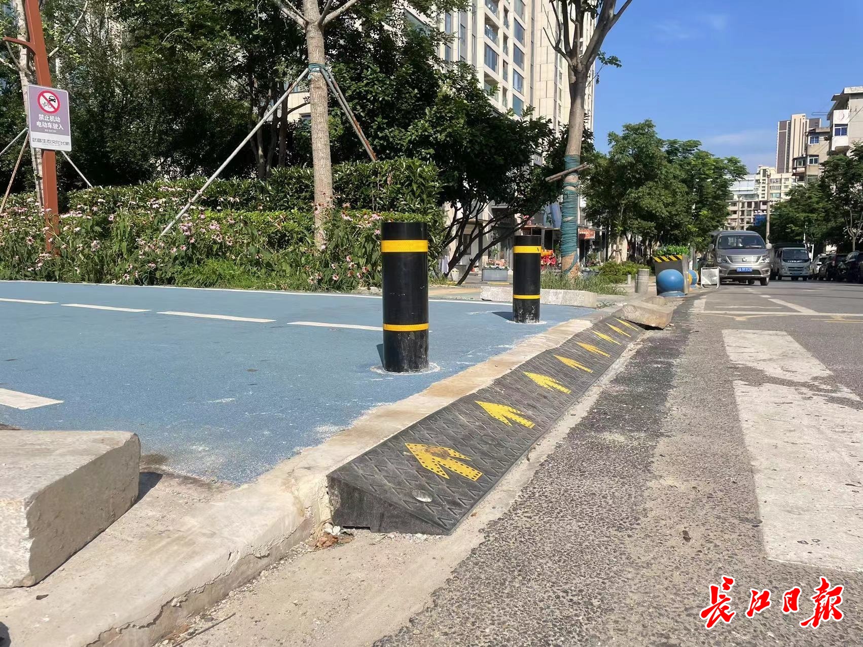 6月13日,记者来到位于四美塘文化公园的项目建设方武汉天创建设集团有限公司办公地点。一名黄姓负责人告诉记者,接到市民投诉建议后,他们迅速作出反应,目前绿道全线所有路口都已铺设斜坡垫,进行了降坡处理。