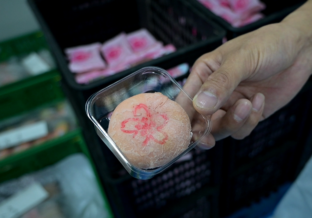 添加了关山樱花的粉色绿豆糕。记者郝天娇 摄