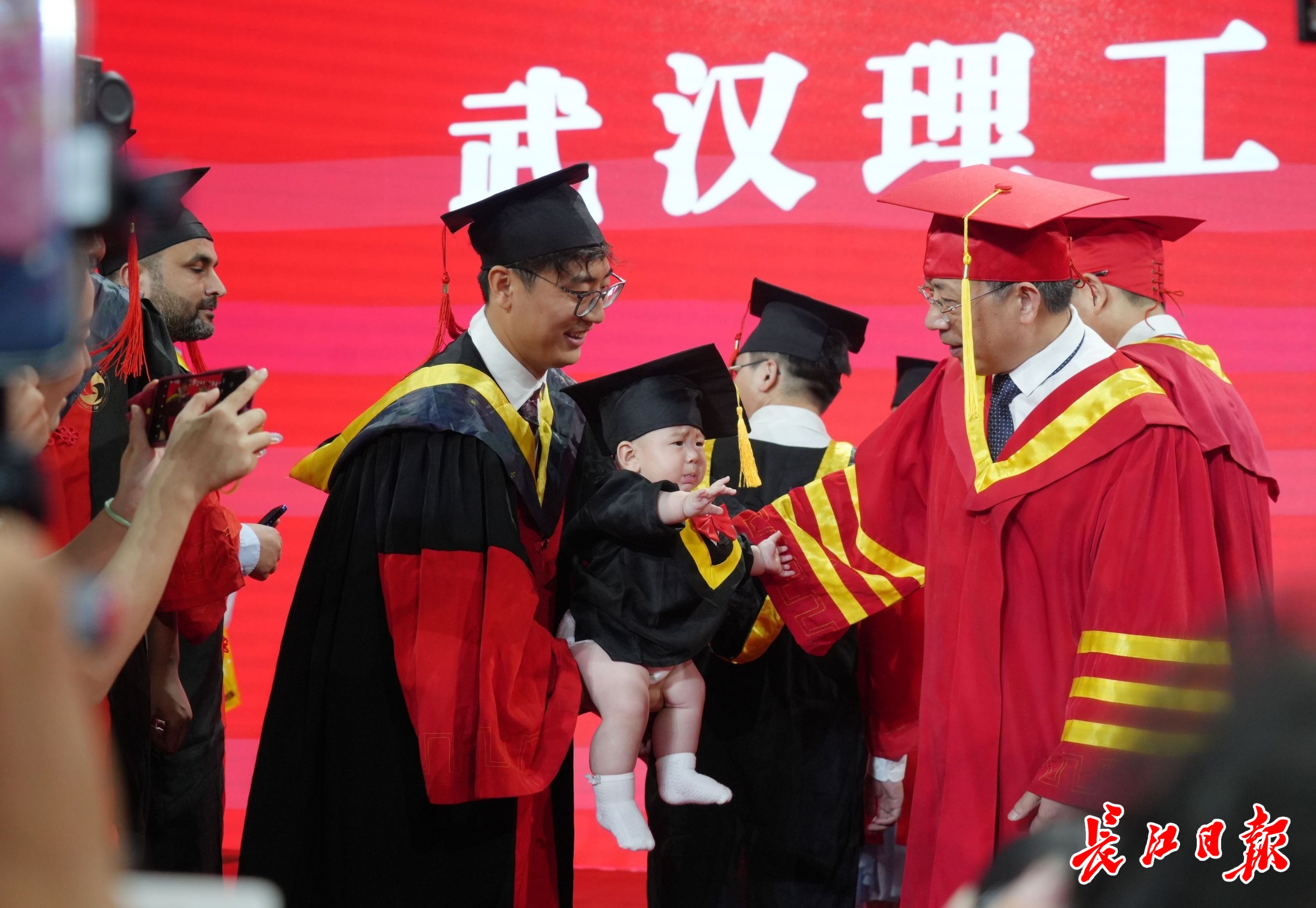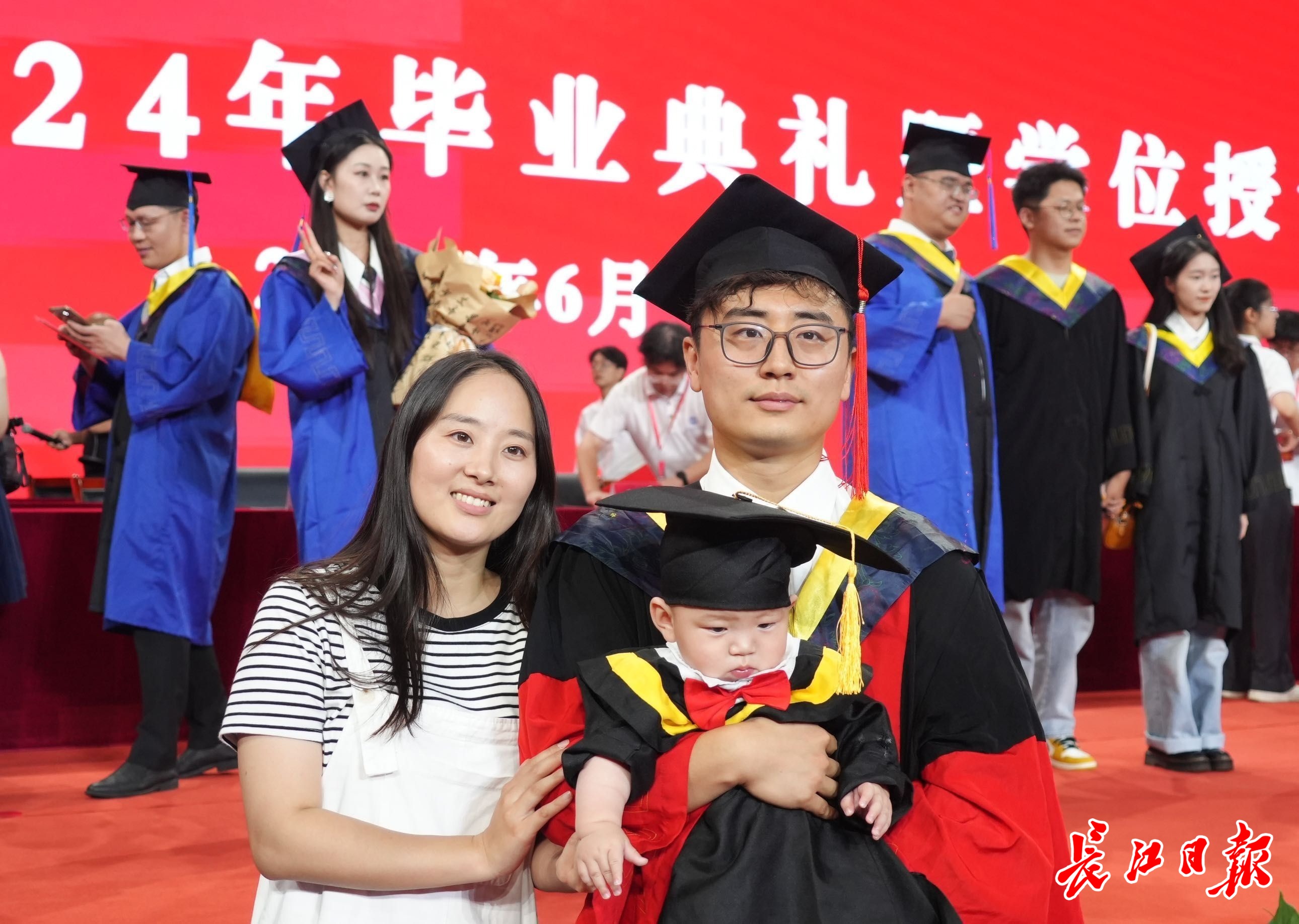 长江日报大武汉客户端6月15日讯 “今天我博士毕业了,特意带着妻子和孩子过来,一起见证这一重要时刻!”15日上午,武汉理工大学2024年毕业典礼暨学位授予仪式现场,李承瑜怀抱7个月大的儿子,旁边站着他的妻子,一家人笑得特别开心。