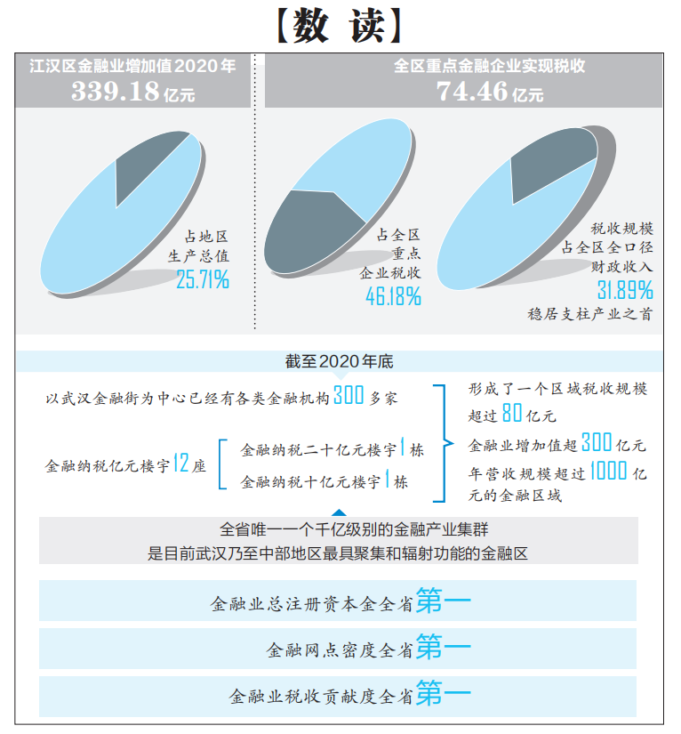 江汉作为武汉市金融业集聚程度最高的地区,位于辖区的武汉金融街金融集聚区约7平方公里,是2010年省政府授予的全省唯一的“省级金融业集聚发展示范园区”。