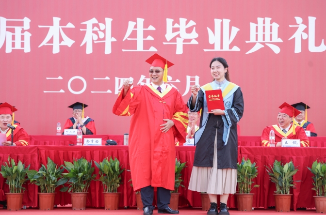 长江日报大武汉客户端6月18日讯(记者汪洋 通讯员陈凌)18日上午,湖北工业大学2024年本科生毕业典礼暨学位授予仪式上,荆新雅作为优秀毕业生代表上台领奖,她特意带上自酿的米酒,请校党委书记彭育园品尝。