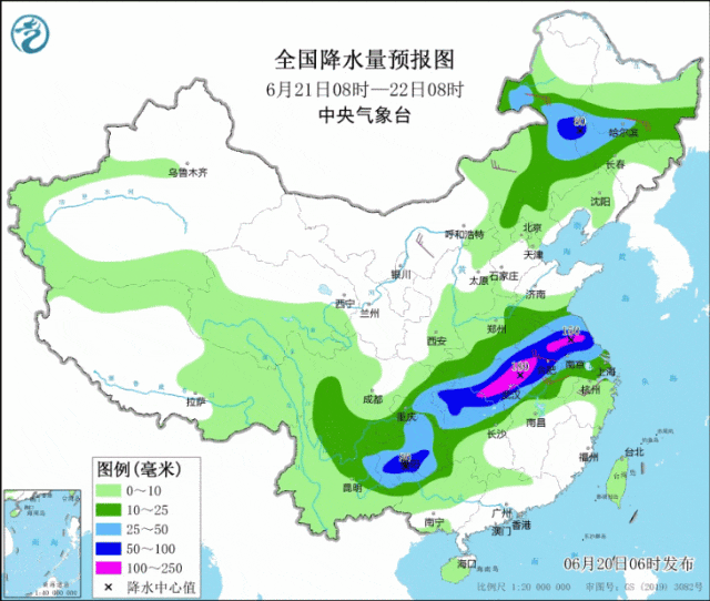 预计21-24日,河南南部、湖北、江苏、安徽、贵州、云南中东部、湖南北部、江西北部、上海、浙江中北部等地将自北向南先后有大到暴雨,湖北、安徽、江苏等地局地大暴雨,贵州南部、湖北东部、湖南中北部、江西北部、安徽中南部、江苏南部、浙江西部等地累计降雨量100~180毫米,局地200~300毫米。此次过程伴有短时强降水(最大小时降雨量30~50毫米,局地80毫米以上),局地雷暴大风等强对流天气。