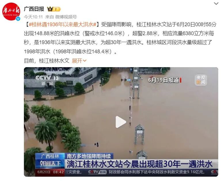 受强降雨及与前期降雨叠加影响,广西、广东、福建等地75条河流出现超警以上洪水,其中广西西江发生第2号洪水,桂江上游发生1958年有实测资料以来最大洪水。