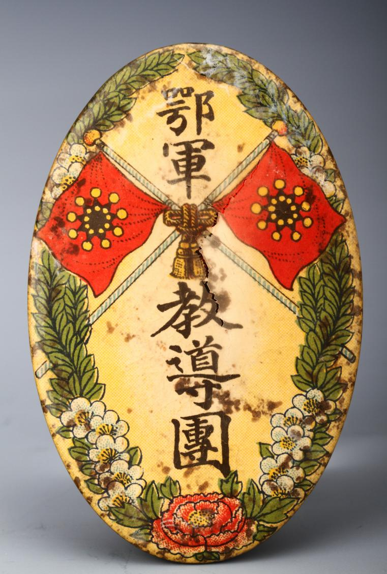 1912年制造,铁质烤漆胸章。徽章正面中上部为两面铁血十八星旗交叉图案,旗杆相交处装饰黄色稻穗花结。正中竖印楷体“鄂军教导团”字样。徽章下部饰以牡丹一朵,寓意国家昌盛、人民富贵吉祥;两侧点缀数朵梅花,寓意湖北革命党人奋勇当先、不惧牺牲、坚韧不拔的革命精神。与民初流行的五色旗与铁血十八星旗相交的图案不同,此章仅采用武昌起义时的军旗——铁血十八星旗,鲜明地突出其地方特色。