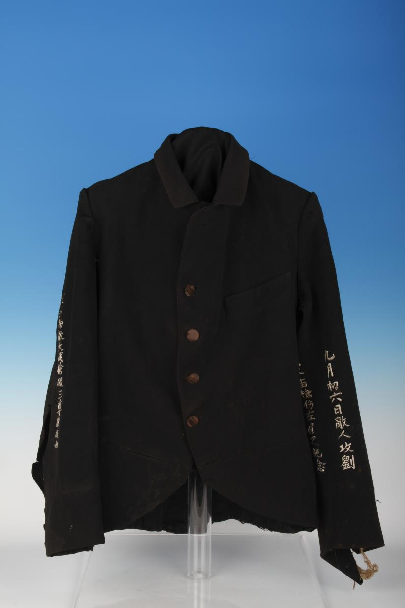 1911年阳夏战争刘家庙战斗中民军敢死队队长黄祯祥所着上衣,左肩部有一枪眼,右袖上有一被划破的开口,两袖均有丝线绣字。左袖上绣着:“九月初六日(10月27日)敌人攻刘家庙枪伤左肩之纪念”;右袖上绣着:“初七日(10月28日)与敌大战,抢炮三尊,敌炮如雨,打断右膀。今共和成立以作纪念”。