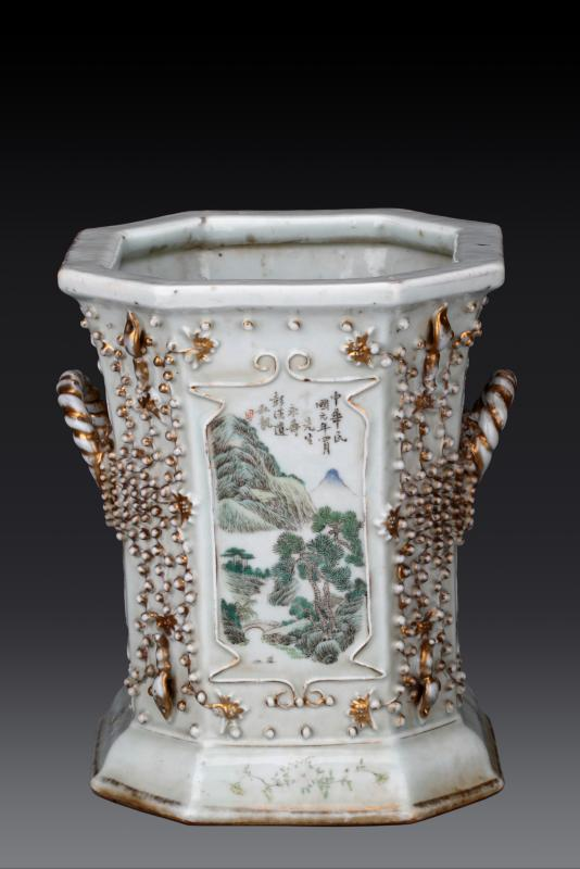 彭汉遗赠孙中山粉彩开光山水人物图索耳花盆。辛亥革命博物院供图