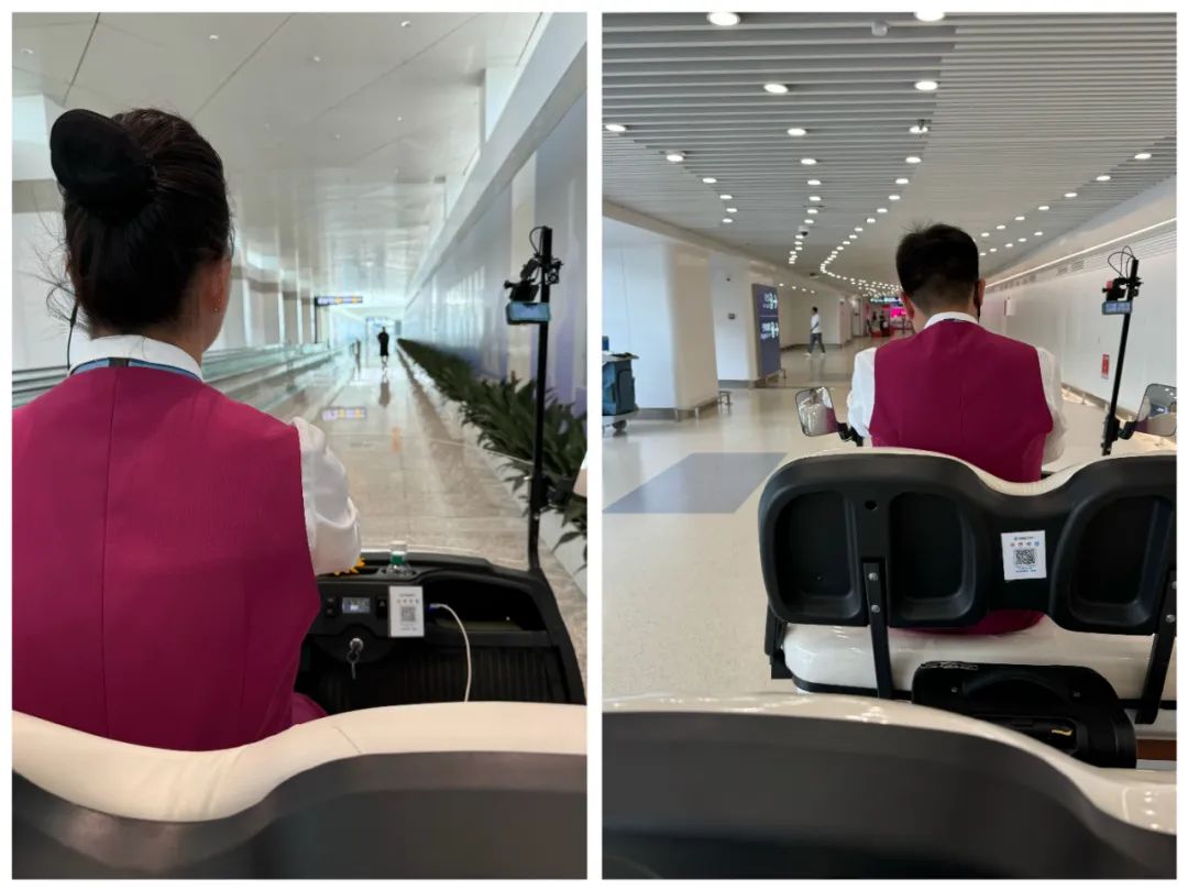 只用了5分钟左右,我过了安检,一下电梯,就有辆摆渡车停在那边,车上有一名司机小姐姐。我赶紧上车,小姐姐开车载着我赶往T2航站楼。在这期间,我听到她帮我联系同事:“有一个乘客走错了航站楼,是16:30起飞的航班,要尽快来接一下。”到了停车点后,我顺利换乘另一辆摆渡车赶往登机口。