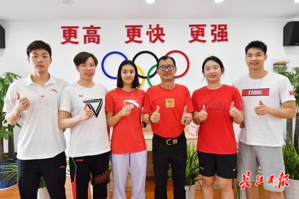 余宗达(左一)、陈洁(左二)、艾衍含(左三)、王宇天(右一)与教练合影。长江日报记者喻志勇摄
