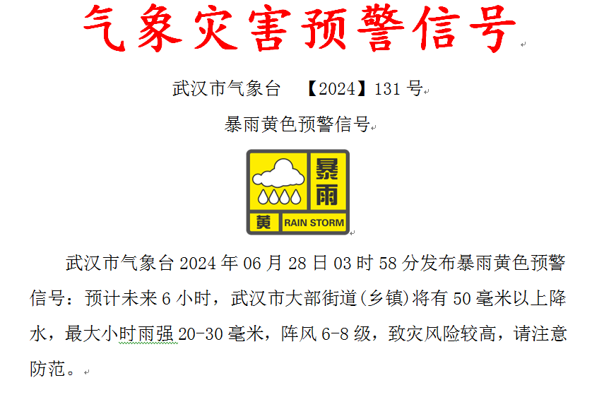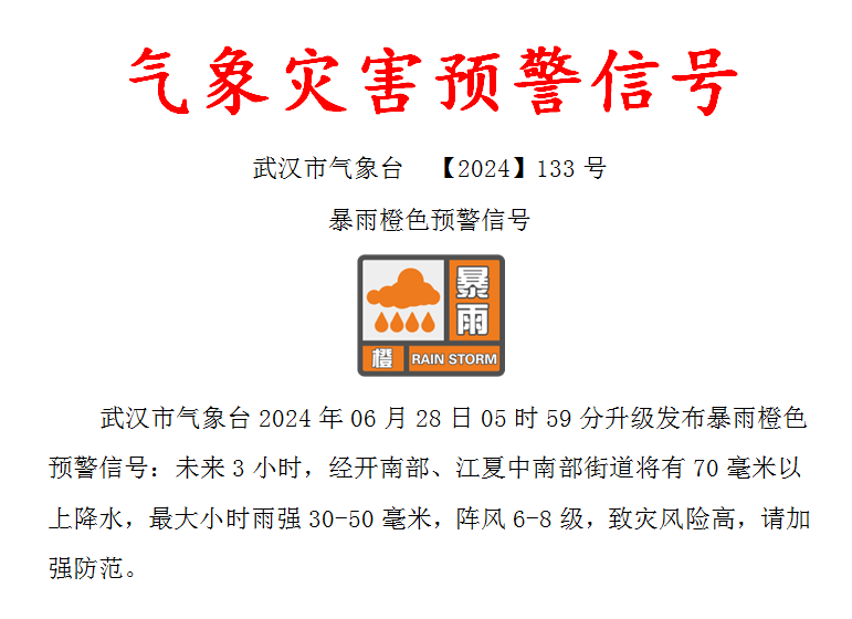 · 武汉三天天气预报 ·今天(28日)白天:阴天有大到暴雨,伴有短时强降水、雷暴大风等强对流天气