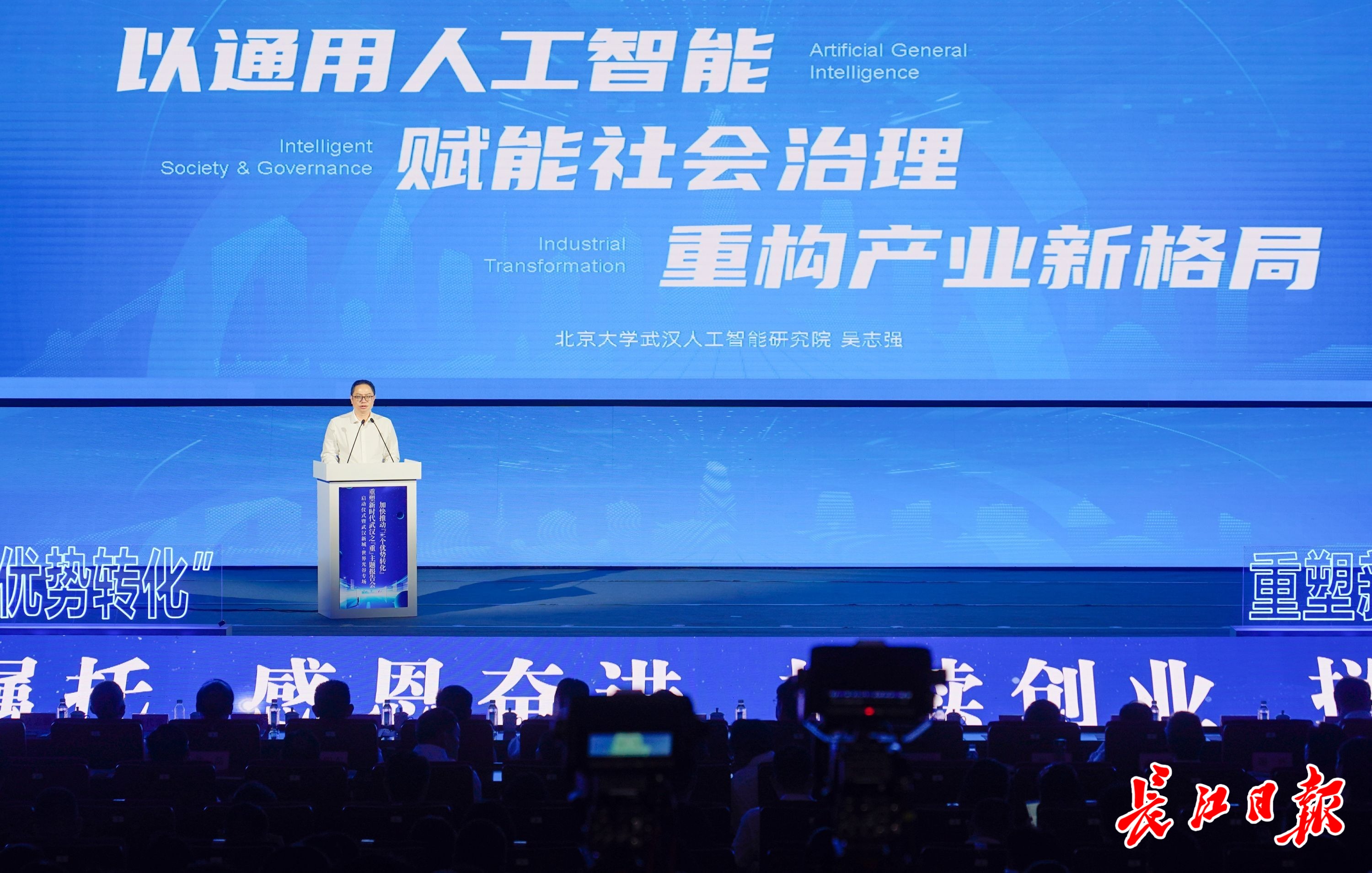 吴志强说,从未名湖到东湖,从中关村到光谷,从“通通”到“大型社会模拟器”,北武院坚持原创引领打造光谷的通用人工智能新篇章,以通用人工智能赋能社会治理,重构产业新格局,推动世界光谷建设。