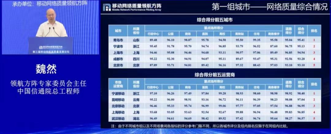 全国百城重点区域移动网络质量专项评测中,排名前五的城市、运营商。