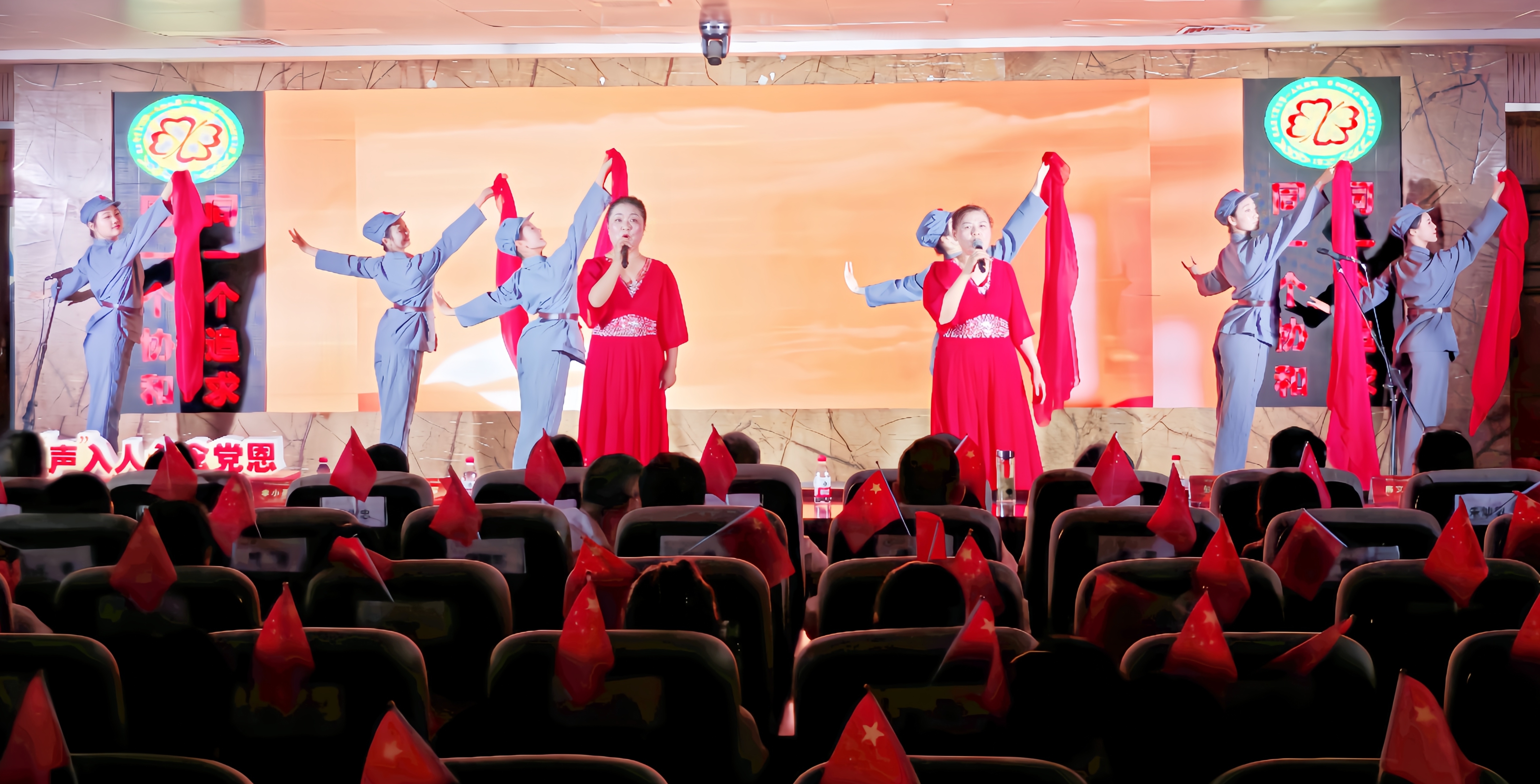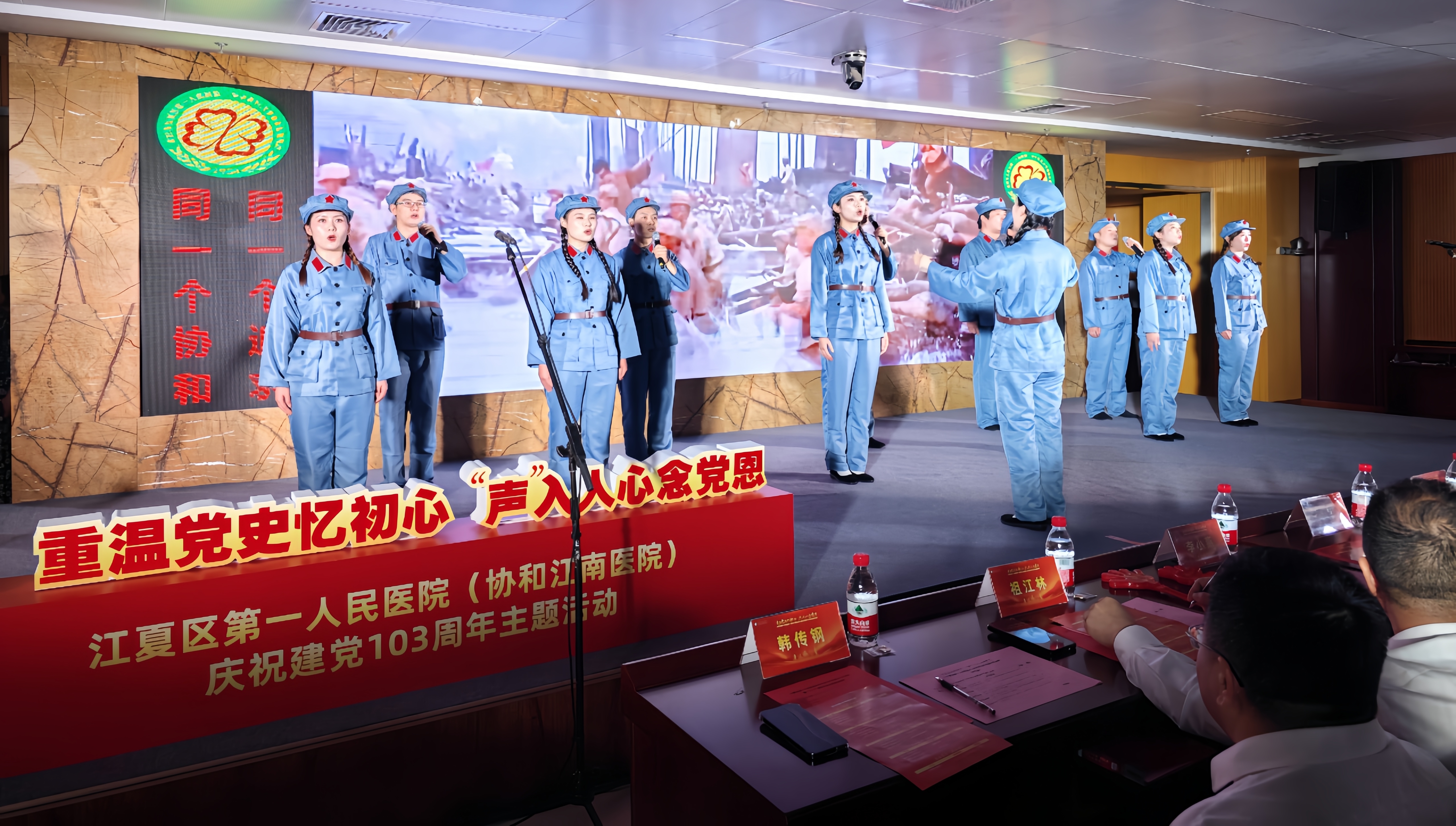 重温党史忆初心 ,“声”入人心念党恩。活动中,来自该院临床、医技、行管、后勤等26个党支部近百名党员组成的10支队伍,通过“曙光”“中流砥柱”“基石”“使命”“新时代”五个篇章,将《秋瑾》《建党伟业》《建军大业》《建国大业》《地道战》《集结号》等经典影视作品片段及《祖国不会忘》《国际歌》《中国人民解放军军歌》《兄弟》《追寻》《英雄赞歌》等红色歌曲有机结合,以“背景短片轮播+红色影片配音秀+红色歌咏+舞蹈”的形式,全景式、沉浸式回顾了中国共产党自成立以来的历史进程、伟大贡献和新时代使命。