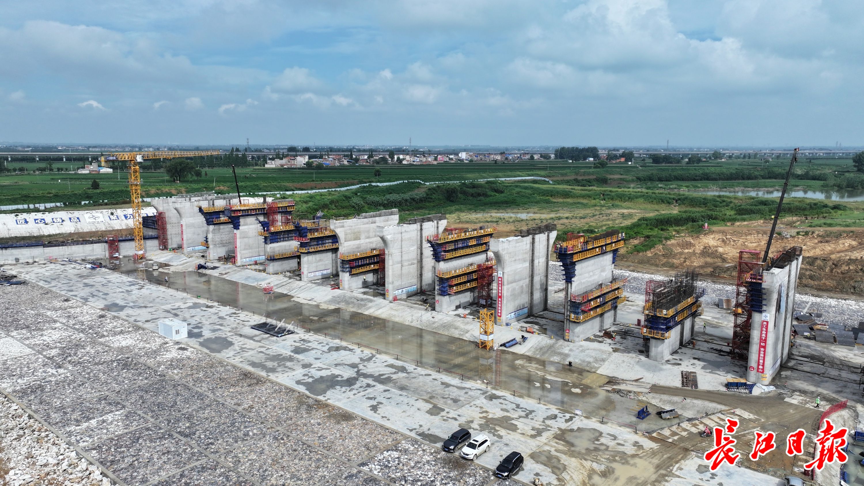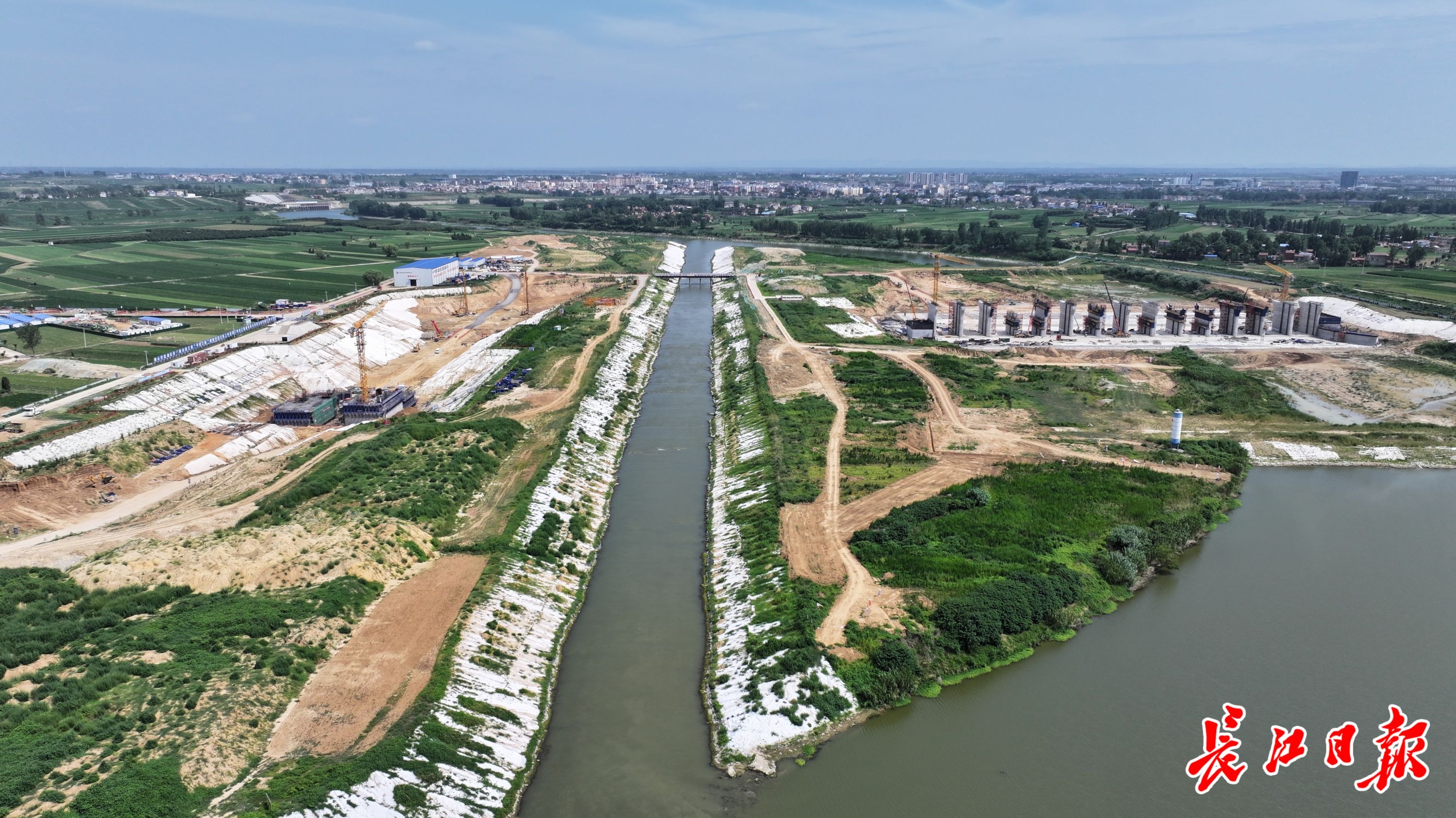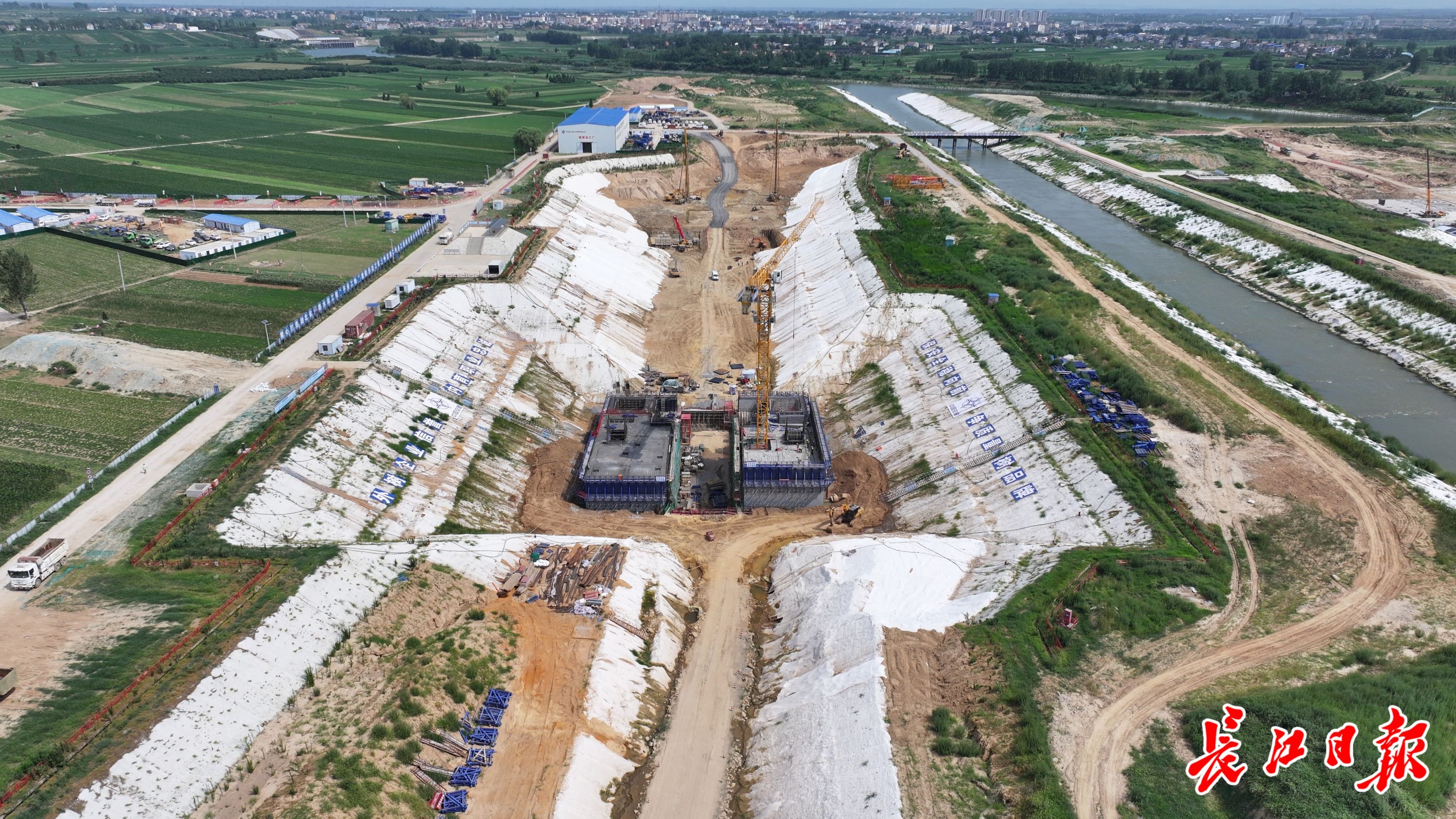 长江日报记者在唐河导流明渠穿越施工现场看到,东边船闸工段,深基坑内塔吊转运着模板材料,上下闸首施工作业正在忙碌进行;西边是泄水闸工段,底部防冲消能设施已经施工完毕,21个闸墩一字排开。