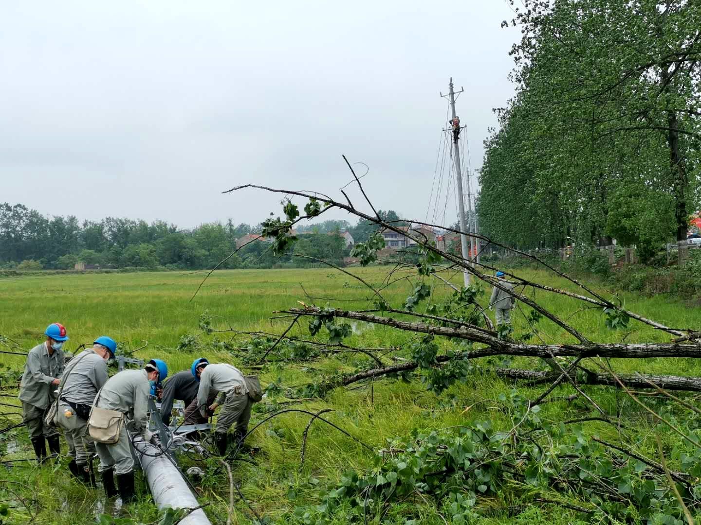 国网武汉市江夏区供电公司对因树木倒伏导致的受损供电线路进行抢修。国网武汉供电公司供图