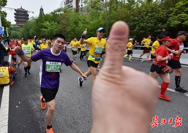 武汉马拉松上,一位热心市民不停地喊“加油”,并伸出大拇指,为选手点赞。记者金思柳 摄(资料图片)