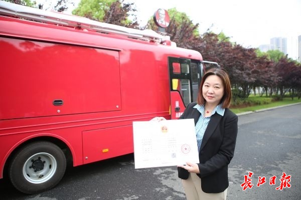 5月11日,百胜餐饮(武汉)有限公司相关负责人领到湖北首张首张移动餐车食品经营许可证。长江日报记者张智 摄