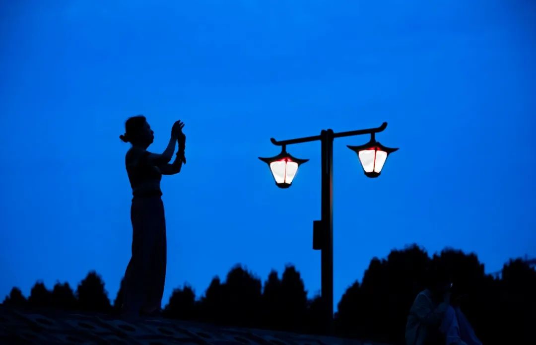 晨光微露或暮色四合,天边挂着一抹蓝,不深不浅,恰似梦境边缘。摄影师的镜头下,女子立于夜幕路灯下,手机轻举,定格这份宁静与神秘。她的身影与深蓝交织,动人而美好。