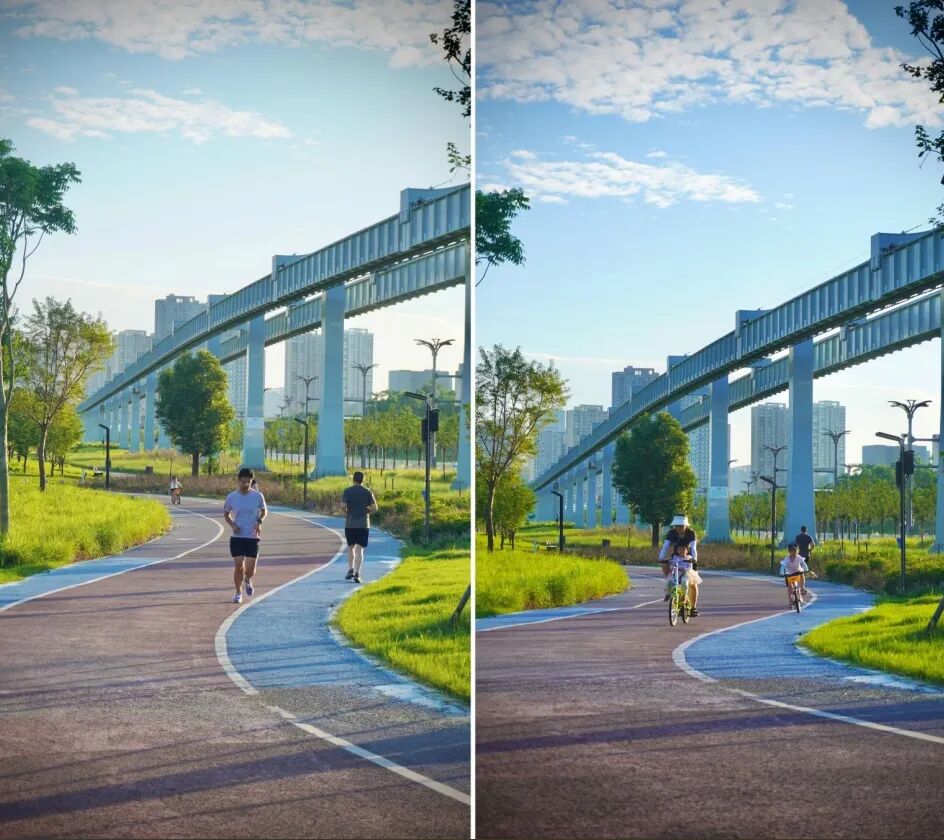 抬头望去,空轨的轨道宛如一条银色丝带,悬挂在天际。我们沿途骑行,看到不少人在晨练。两旁绿树成荫,花香扑鼻,孩子们不时指着路边的花草,兴奋地讨论着它们的名字和颜色,偶尔还会自由奔跑。