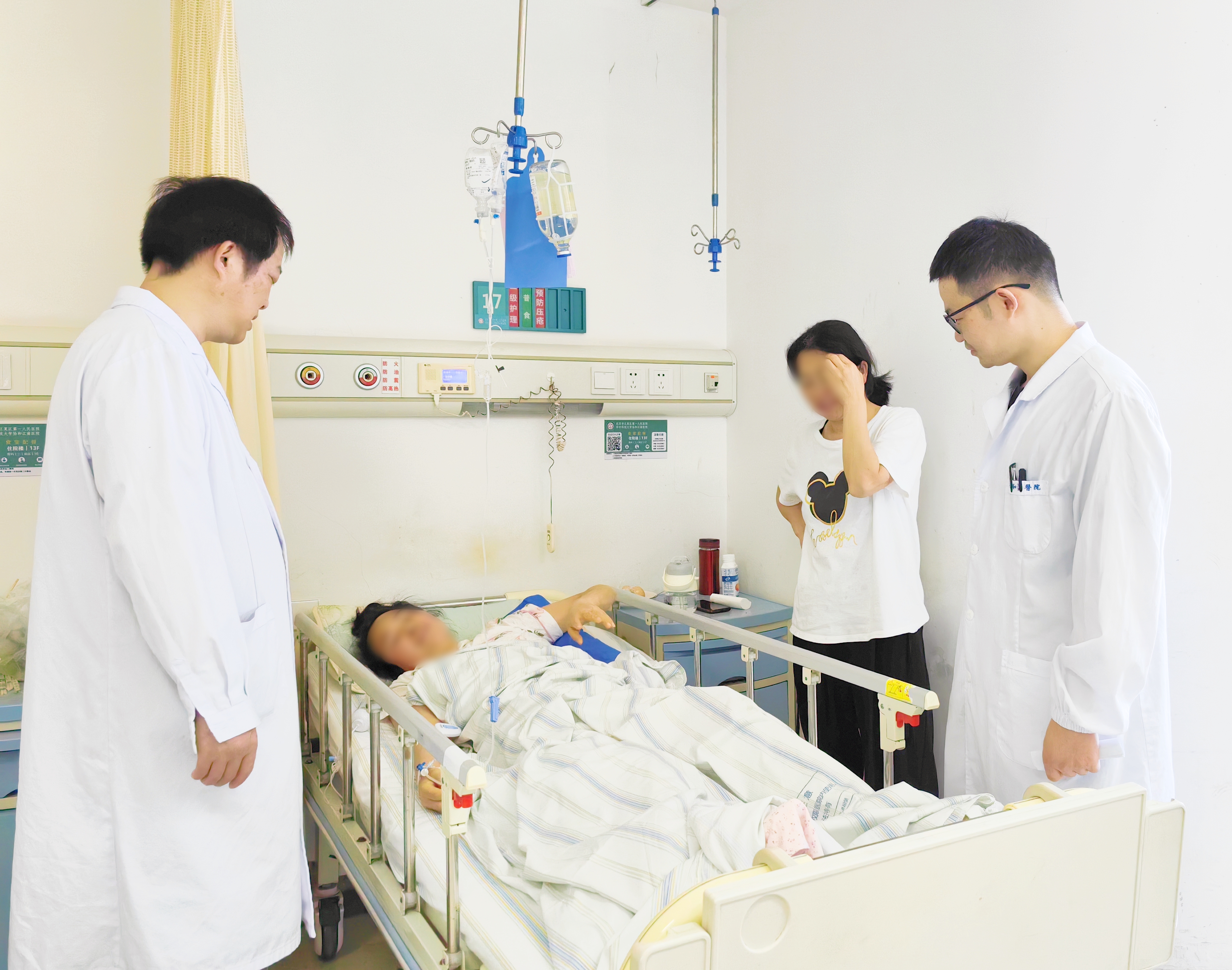 医生早查房时与李女士交谈。