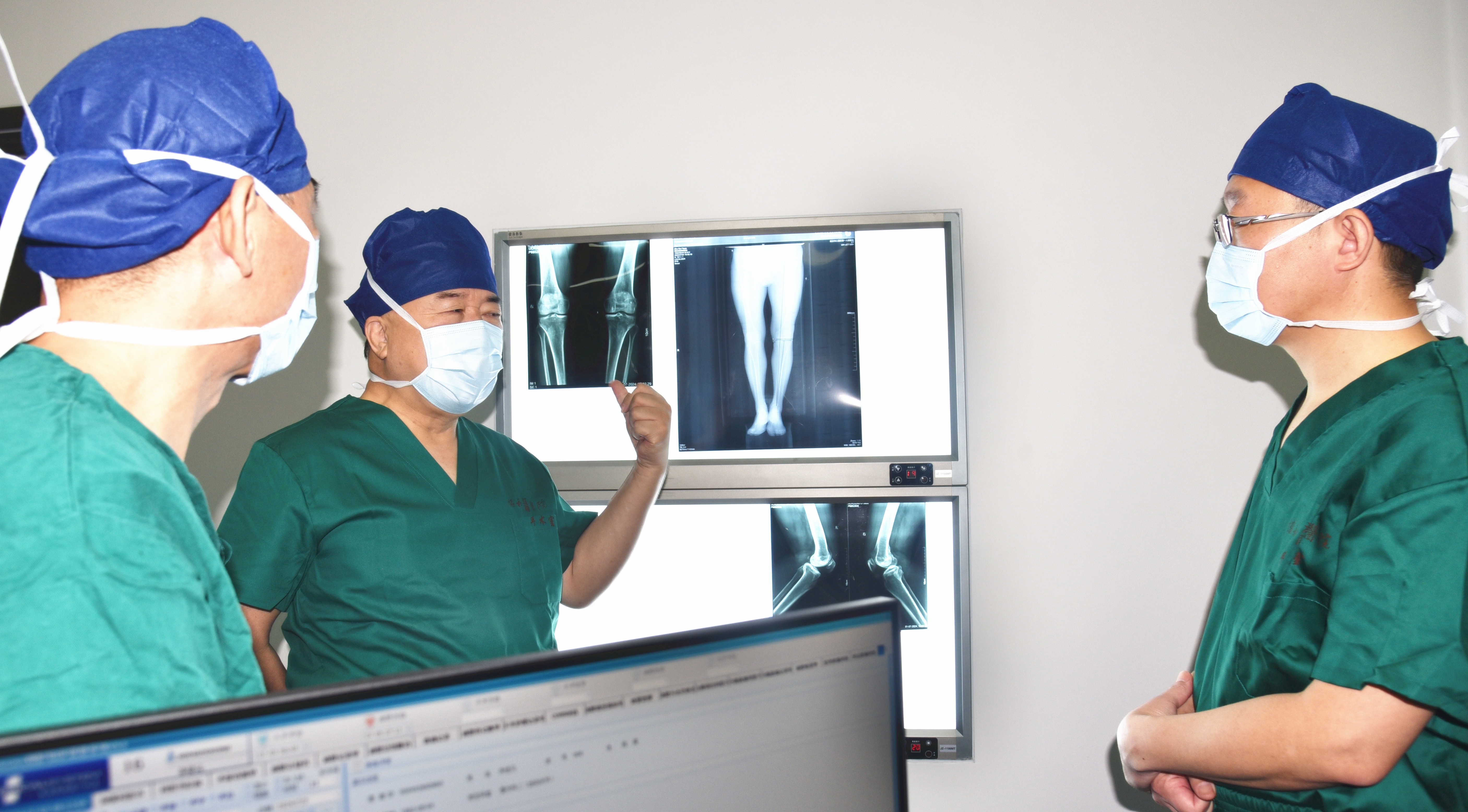 据了解,患者朱爷爷2年前无明显诱因开始出现双侧膝部隐痛不适,经保守治疗,右膝部症状缓解,但左膝部症状仍反复发作,且逐渐加重,并发展成左膝关节内翻畸形(俗称O型腿)。在获悉张英泽院士在江夏区“院士门诊”信息后,他住进了江夏区第一人民医院(协和江南医院)骨科。经张英泽院士及其团队远程会诊,为他制定了由张院士自主研发的“改良胫骨高位截骨术”治疗方案,确定张英泽院士为其“截骨保膝”。