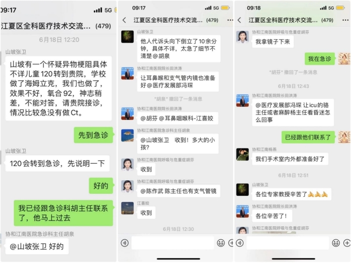 “事发突然,小孩情况危急,线上调度、全院动员,确实很惊险。”据该院医疗发展部主任冯琛回忆,6月18日中午12时许,在该院与辖区基层卫生院搭建的“江夏区全科医疗技术交流”群中,江夏区山坡中心卫生院张卫医师发出了请求救援的信息。