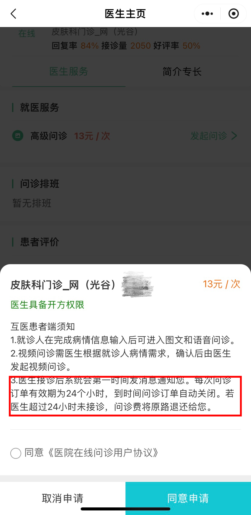 在武汉市第三医院的在线问诊平台记者看到挂号须知中对回复时间有所提示,有效期为24小时。