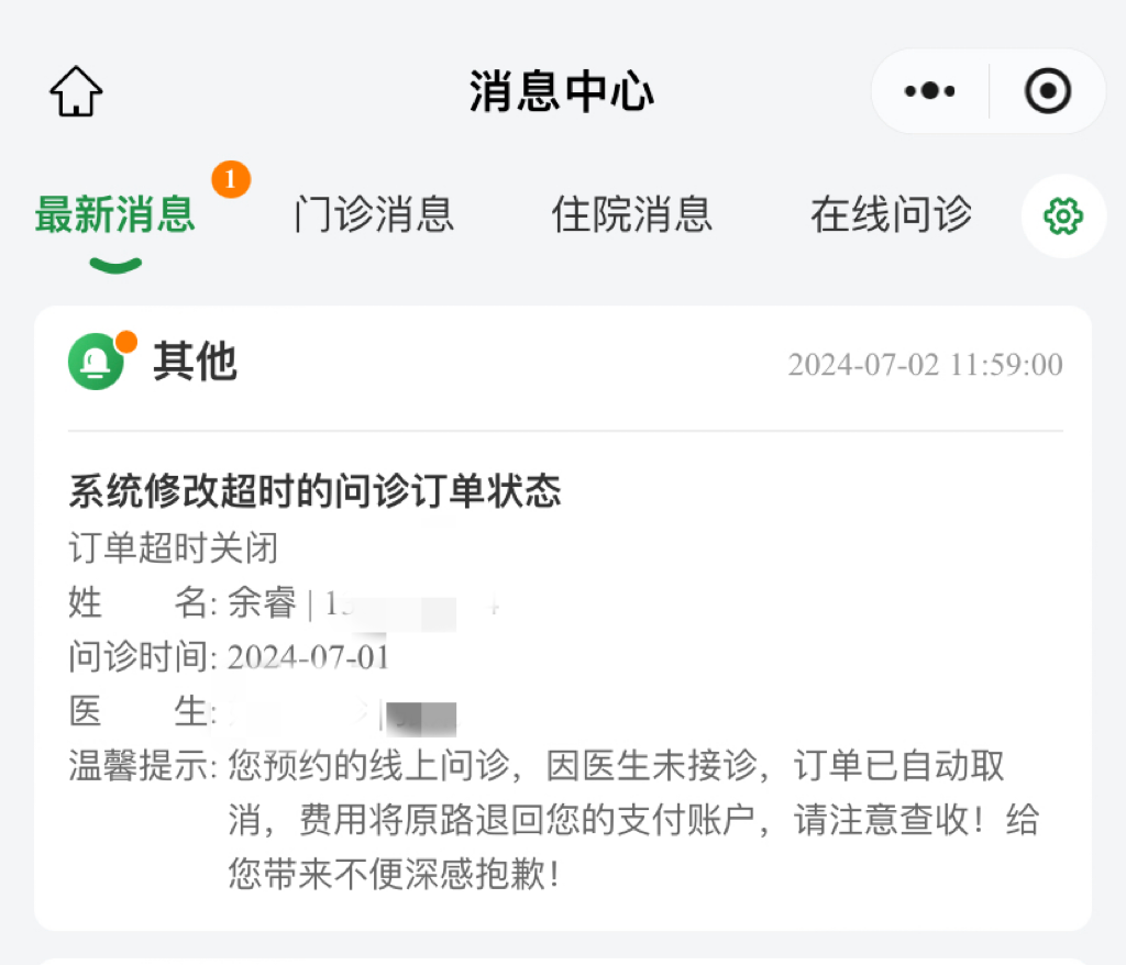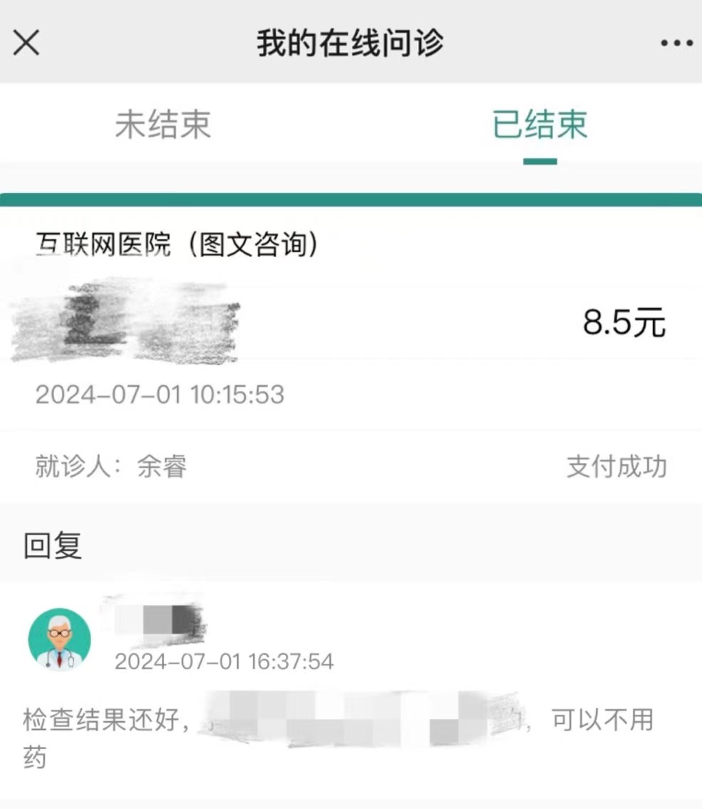 “我从当天中午12时等到了第二天,一直没有收到回复。后来,我收到一条短信:线上问诊已经超时,费用将原路退还。”由于上班不好请假,余女士只好选择在一家商业线上问诊平台花了5.9元咨询,“30秒就回复了”。
