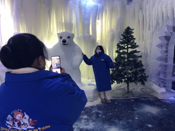 在冰雪大世界内,游客与北极熊雪人欢乐打卡。通讯员供图