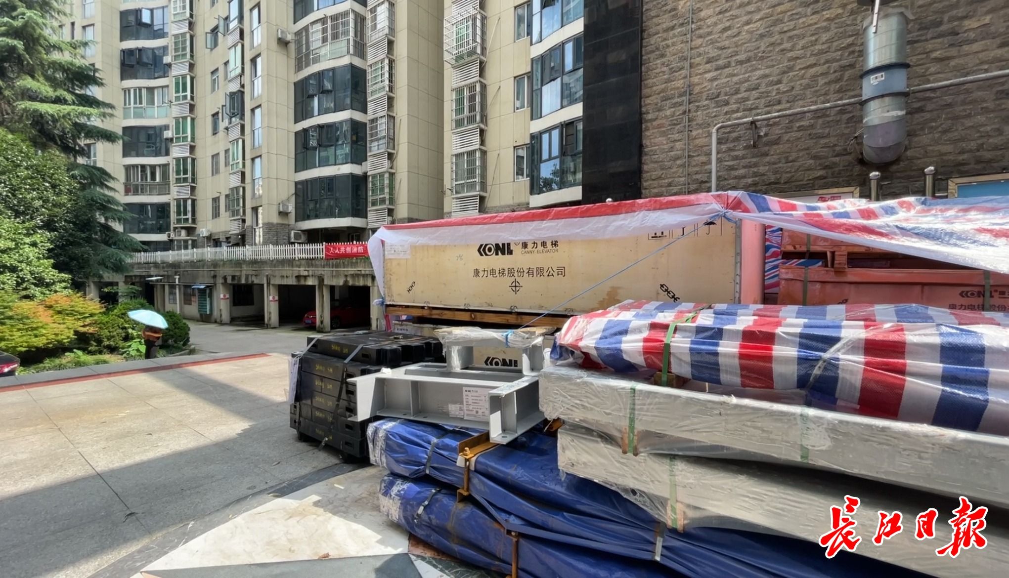 7月2日,安装电梯之前,一些电梯部件被运抵小区。 记者杨荣峰 摄