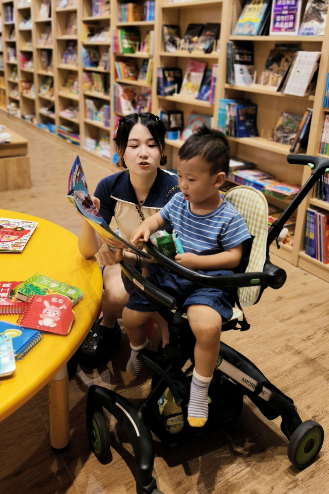 在江岸区永旺梦乐城,一位家长带着小宝一起阅读,画面温馨而美好。