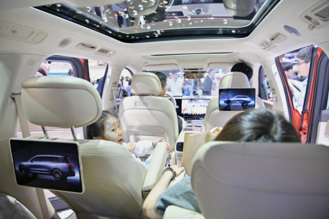 5月4日,参观者在2024北京车展上体验一款使用华为鸿蒙系统的汽车。 新华社发