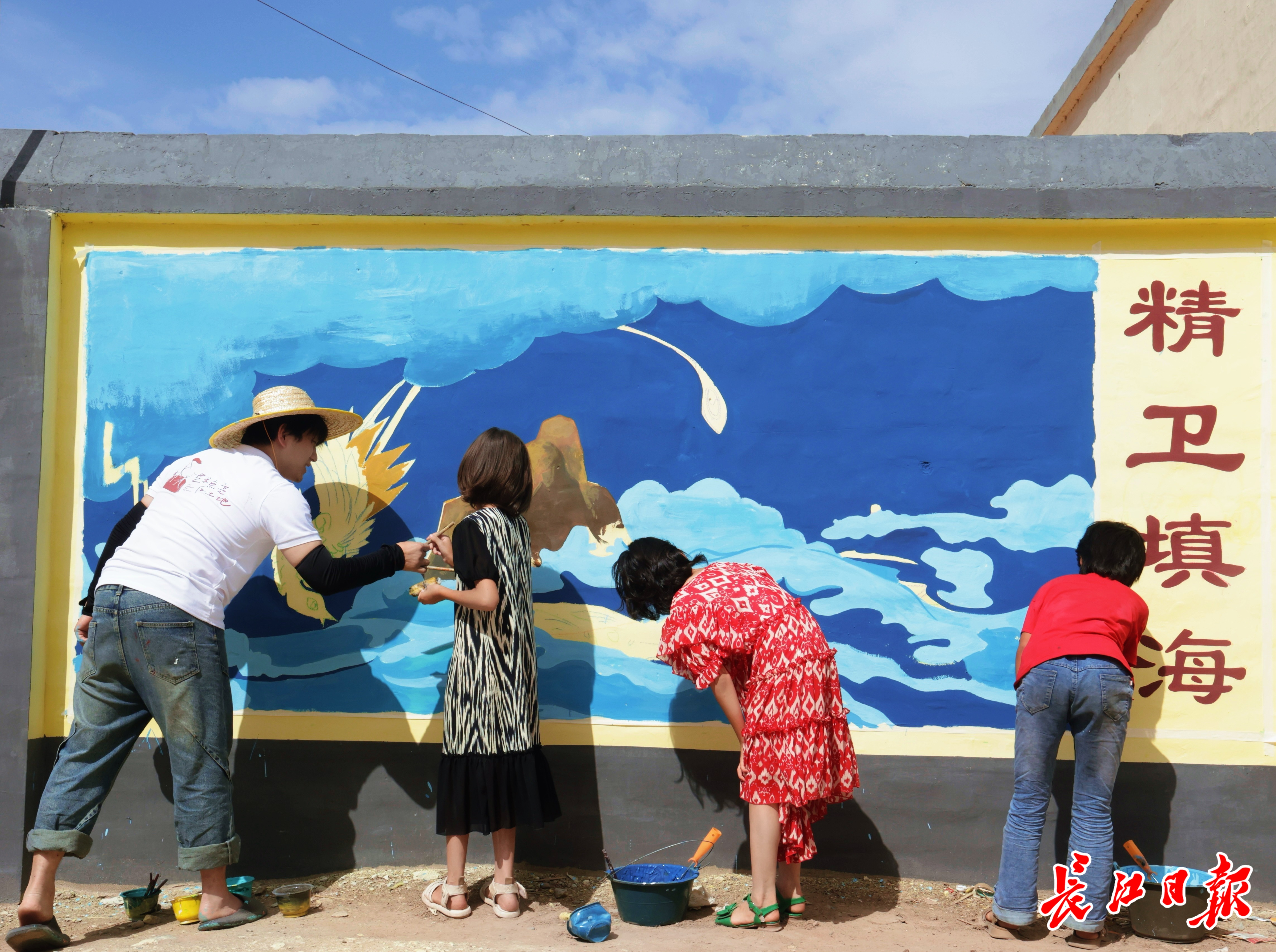 墙上画的是精卫填海的故事,画中的蓝色大海与头顶湛蓝的天空相连。