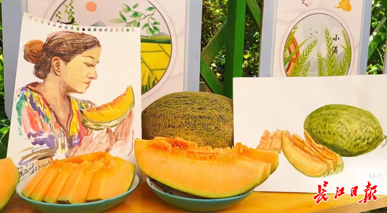 7月15日,新疆喀什伽师县铁日木村,湖北美术学院“艺术点亮红土地”团队成员、傣族小伙岩温叫送给维吾尔族姑娘热沙来提一幅画,画上是穿着亮丽特色服饰的她和金灿灿的伽师瓜。