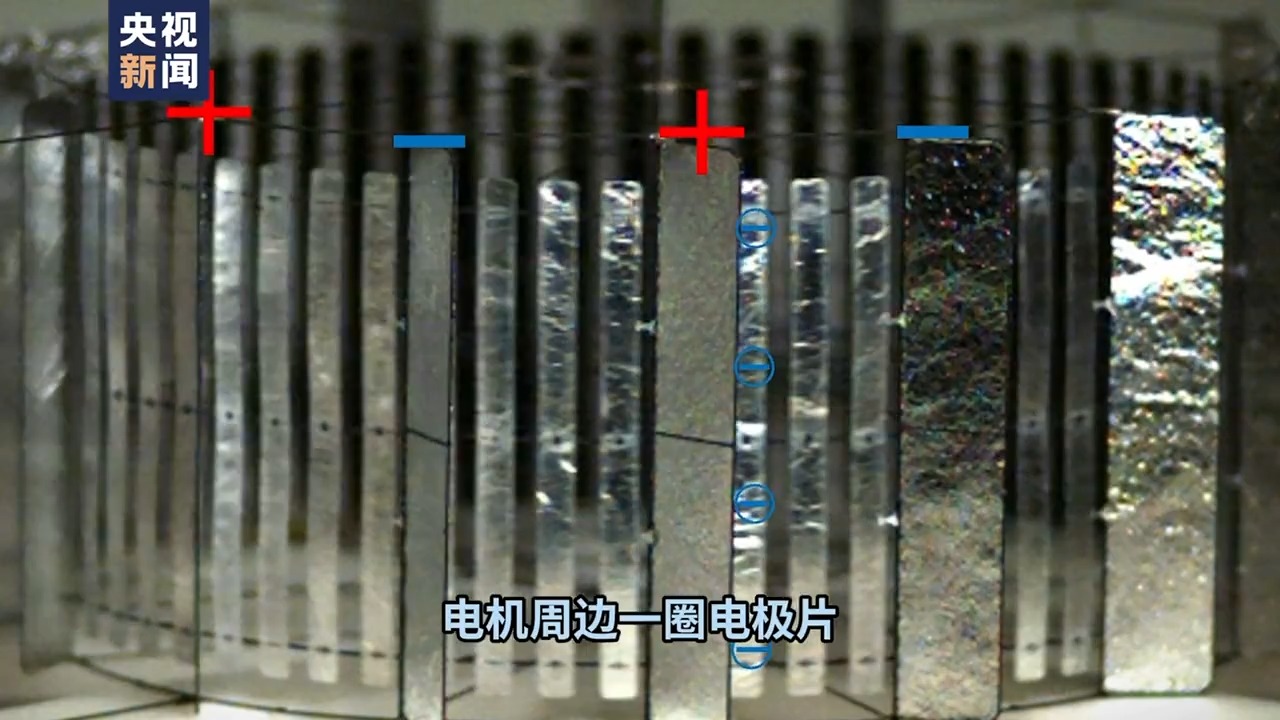 电机周边一圈电极片,它遵循同性相斥、异性相吸的原则。相邻的两个电极片带有完全相反的电荷,在中间运动的电极片会被它右侧的电极片排斥,被左侧的电极片吸引,最终形成一个升力带动整个飞行器起飞。