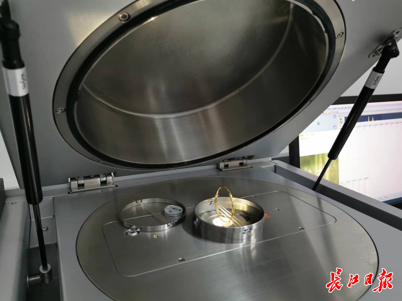 记者在检测室看到,一枚金黄色的手镯被固定在一台检测仪器中央,检测人员将检测仪器合上盖,一旁的计算机屏幕闪动,很快电脑显示:99.99。这意味着,这枚手镯黄金含量符合国家相关标准,属于足金。